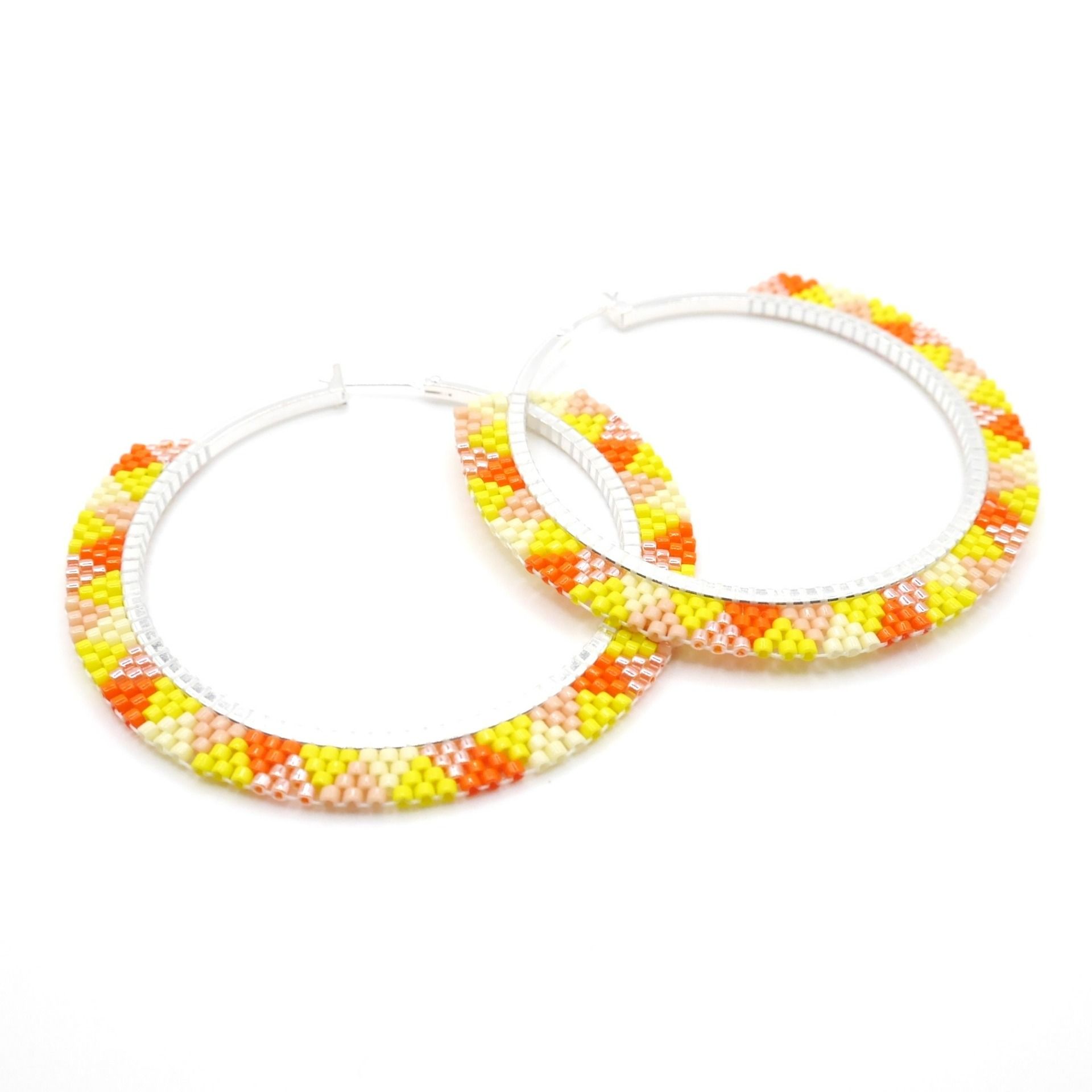Grandes créoles de 6 cm de diamètre en laiton recouvertes d'une finition en argent fin d'une épaisseur d'environ 5 microns.